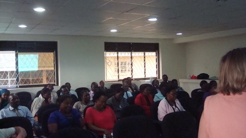 The first training workshop of the GOSH/Mulago twinning programme was scheduled to start at 8.30am. By 9.30am we had 7 of around 40 expected delegates who spontaneously filled seats from the front of the room (unlike HNA meetings, which fill from the back). By 10.30am most delegates had drifted in and we were ready for the opening prayer (“that we have no power cuts … that we ask the right questions and learn from this workshop”).