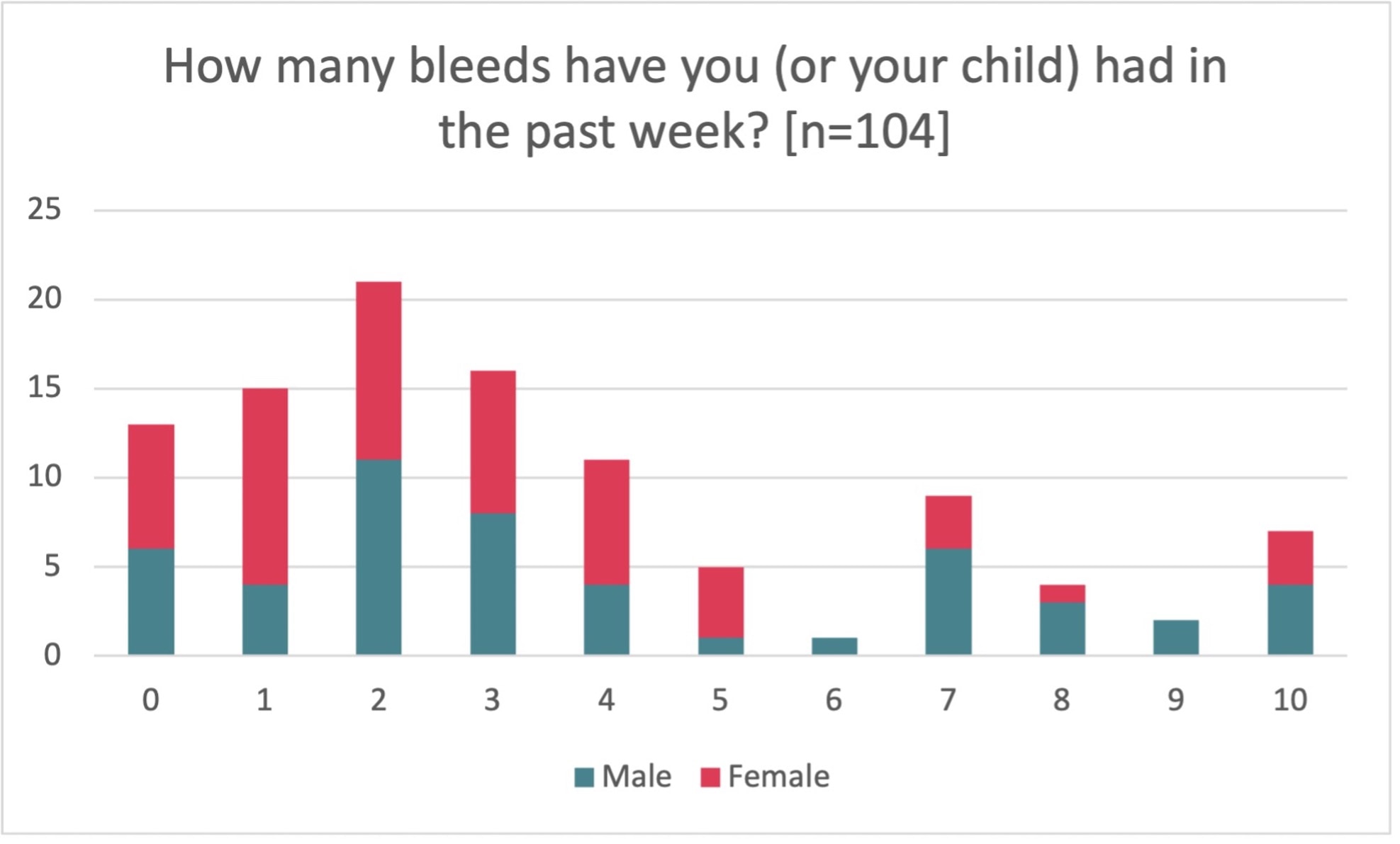 Perhaps most striking was the frequency of bleeds, with 87% of people reporting to have had a bleed in the past week (with an average of 3.5 bleeds in the past week across the data set). This suggests that people with GT deal with a level of bleeding in their day to day lives that would be seen as unacceptable in the severe haemophilia community.